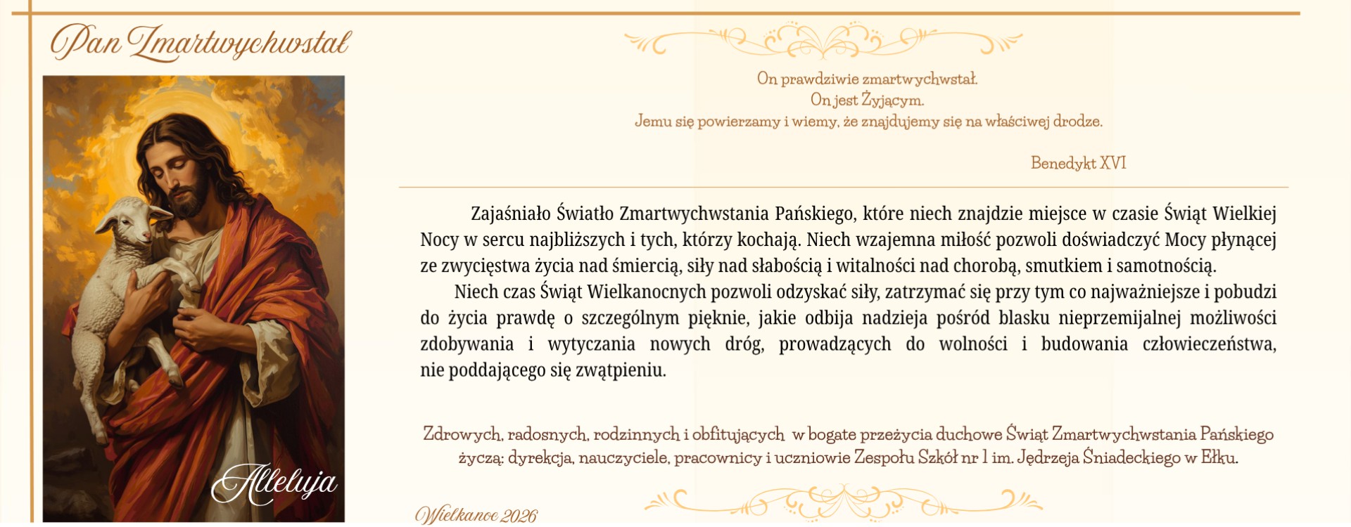 Zdrowych, radosnych, rodzinnych i obfitujących w bogate przeżycia duchowe Świąt Zmartwychwstania Pańskiego życzą: dyrekcja, nauczyciele, pracownicy i uczniowie Zespołu Szkół nr 1 im. Jędrzeja Śniadeckiego w Ełku.