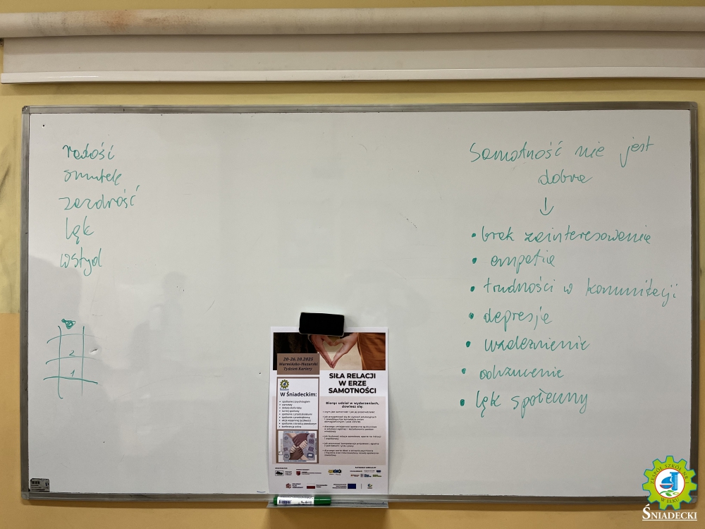 W klasach Branżowej Szkoły I stopnia: 1j – monter jachtów i łodzi oraz Ic2 – wielozawodowa odbyły się warsztaty na temat: „Siła relacji w erze samotności”, które zostały przeprowadzone przez psychoterapeutę – panią Justynę Wojsiat oraz terapeutę środowiskową – panią Dorotę Ramotowską z Ełckiego Centrum Psychoterapii i Psychiatrii. Zajęcia były poświęcone relacjom międzyludzkim, komunikacji i emocjom w dobie cyfrowej izolacji. Podczas warsztatów młodzież rozmawiała o znaczeniu prawdziwych relacji interpersonalnych w rzeczywistym świecie. Prowadzące poruszyły także problem samotności. Uczestnicy wspólnie szukali odpowiedzi na pytanie: jak budować relacje oparte na zaufaniu, zrozumieniu i otwartości.