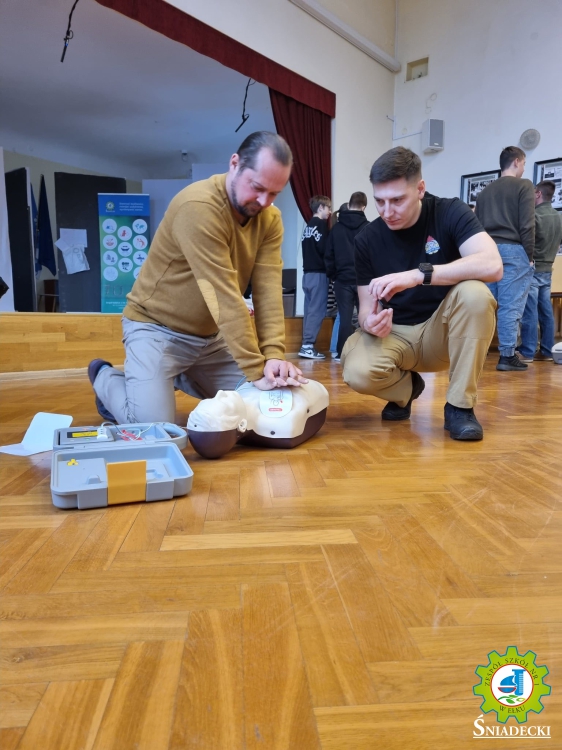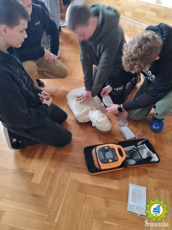 Uczniowie również poznali i nauczyli się używać Defibrylatora AED (Automatyczny Defibrylator Zewnętrzny). Po udanym RKO wspomaganym przez AED uczniowie przystąpili do opatrywania ran i urazów. Zarówno uczniowie jak i Panowie z Komendy Powiatowej Państwowej Straży Pożarnej spisali się na szóstkę.