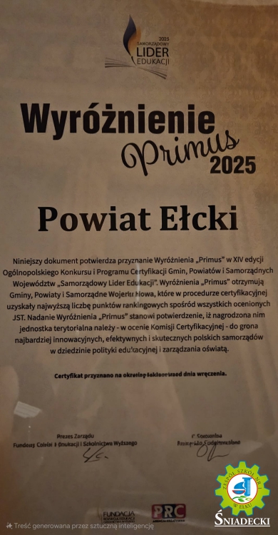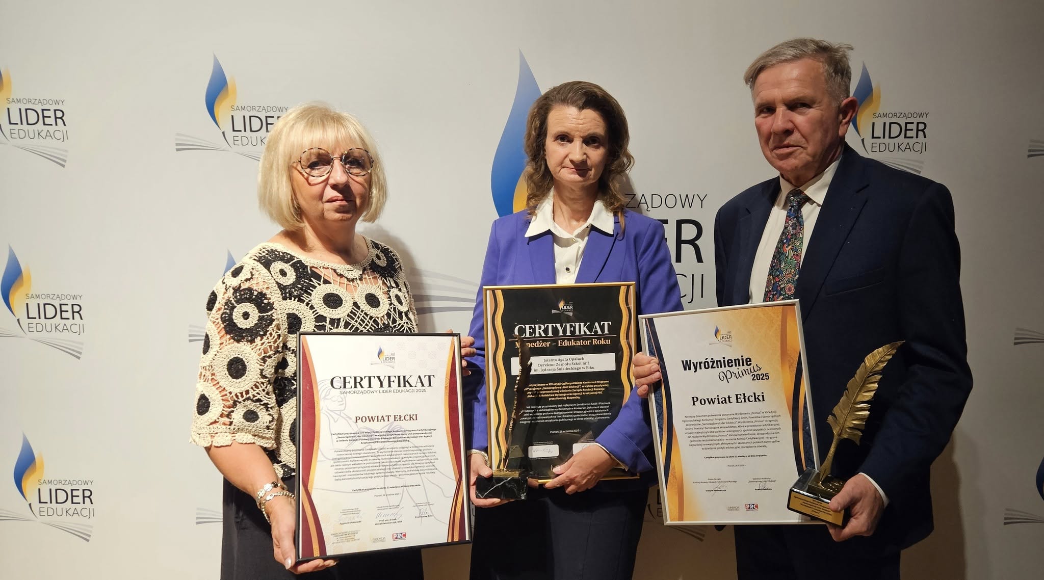 Dodatkowo Powiat Ełcki został uhonorowany Wyróżnieniem PRIMUS – potwierdzeniem, że znalazł się w czołówce najlepszych samorządów w kraju, zdobywając jedną z najwyższych ocen w procesie certyfikacyjnym. Certyfikat SAMORZĄDOWY LIDER EDUKACJI oraz Wyróżnienie PRIMUS dla Powiatu Ełckiego odebrał Starosta Ełcki Marek Chojnowski wraz z Naczelnikiem Wydziału Edukacji Mariolą Raczyńską.