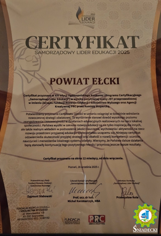 W 14. edycji ogólnopolskiego konkursu Powiat Ełcki otrzymał Certyfikat SAMORZĄDOWY LIDER EDUKACJI 2025! To prestiżowe wyróżnienie przyznawane jest samorządom, które w sposób nowoczesny, innowacyjny i odpowiedzialny prowadzą politykę oświatową.