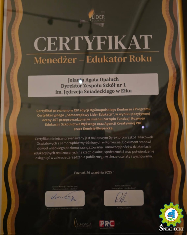 Nagrodę specjalną tytuł MENEDŻERA-EDUKATORA ROKU otrzymała Jolanta Agata Opaluch, dyrektor Zespołu Szkół nr 1 im. J. Śniadeckiego w Ełku – nagroda ta przyznawana jest wybitnym dyrektorom placówek oświatowych z certyfikowanych samorządów.
